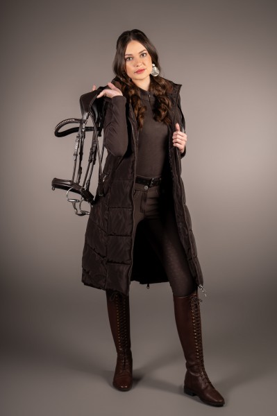 Funktional und stilvoll zugleich: Die Arezzo Langweste überzeugt mit wasserabweisendem Obermaterial und einer wärmenden Wattefüllung – ideal für kühle Tage im Stall oder beim Ausritt , aber auch sonst vielseitig zum Tragen .Der perfekte Begleiter im Alltag und im Berufsleben . Die seitlichen Reitschlitze mit reflektierendem Innendruck bieten optimale Bewegungsfreiheit im Sattel und sorgen gleichzeitig für bessere Sichtbarkeit. Aufwendige Details, eine modische Steppung und die großzügige Kapuze mit Kordelzug machen die Weste zum Blickfang jeder Reitgarderobe. Ausgestattet mit Zwei-Wege-Reißverschluss und zwei praktischen Front-Taschen für maximalen Komfort. Erhältlich in den Größen L, XL und XXL.