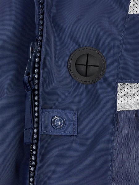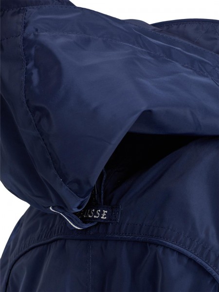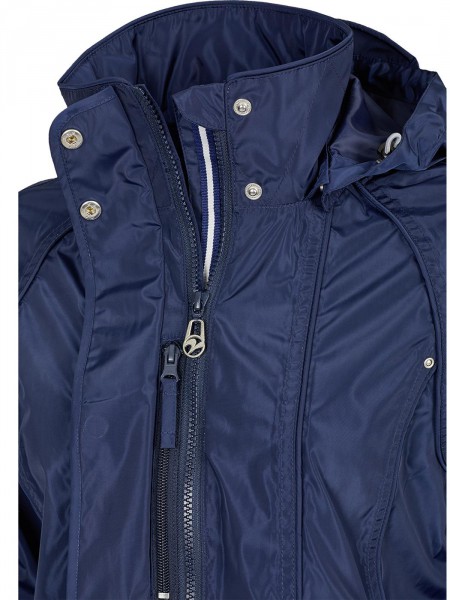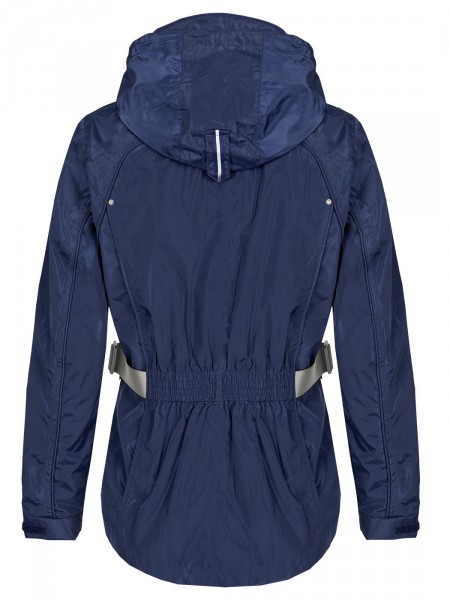 - abnehmbare, regulierbare Kapuze mit formbarem Schirm, Kapuze kann zum Reiten im Rückenbereich fixiert oder im Kragen verstaut werden