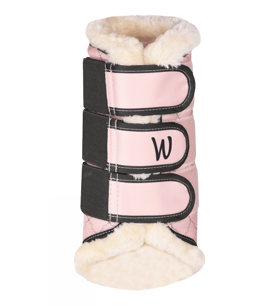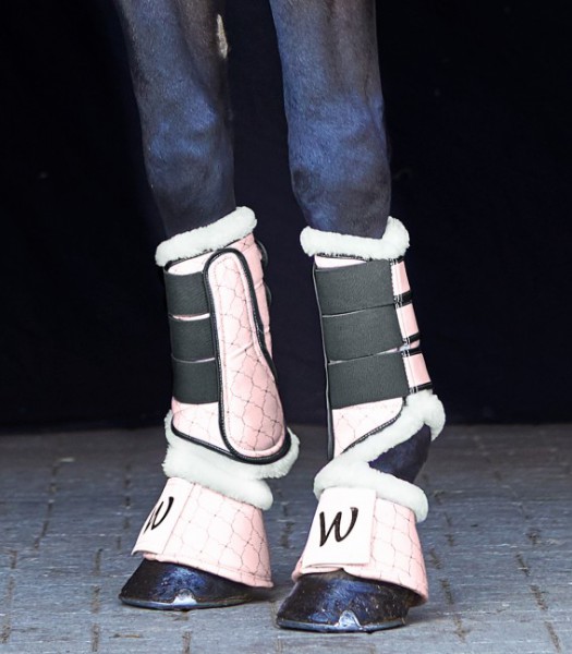 Dressurgamasche mit weichem stoßdämpfendem Kunstfell gepolstert. Mit ansprechendem Muster und glitzerndem W am Klettverschluss. Schützt das Pferdebein optimal. Paar
