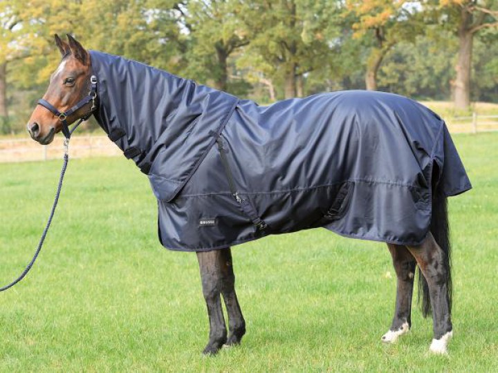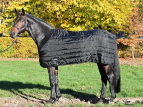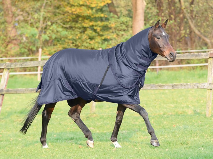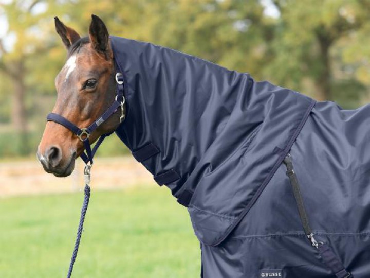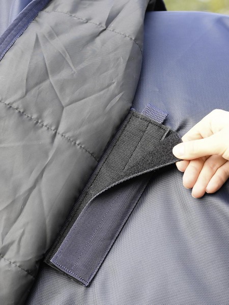 - abnehmbare, längeneinstellbare Elastikgurte auf beiden Seiten können mit entsprechend ausgestatteten Decken verbunden werden, um ein Hochklappen des Halsteils im hinteren Bereich bei Wind oder in der Bewegung zu verhindern