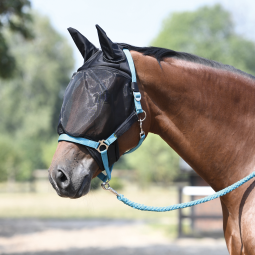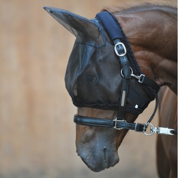 Fliegenmasken mit Ohren aus engmaschigen festem Netzgewebe. Mit Klettverschluss, verstellbar. Elastischer Bund mit Einfassung aus Kunstlamm, dadurch sehr enganliegend am Kopf. Durch den integrierten Neoprenschlauch lässt sich die Maske ideal am Halfter befestigen und somit wird das An- und Ausziehen erleichtert.