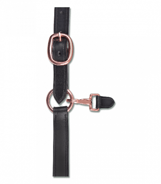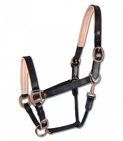 Elegantes Lederhalfter mit weich gepolstertem Nasenriemen und Genickstück sowie rundgenähtem Kehlriemen. Hochwertige Beschläge aus Edelstahl in rosé Farbe. Beidseitig verstellbares Genickstück und einfach verstellbarer Kinnriemen.