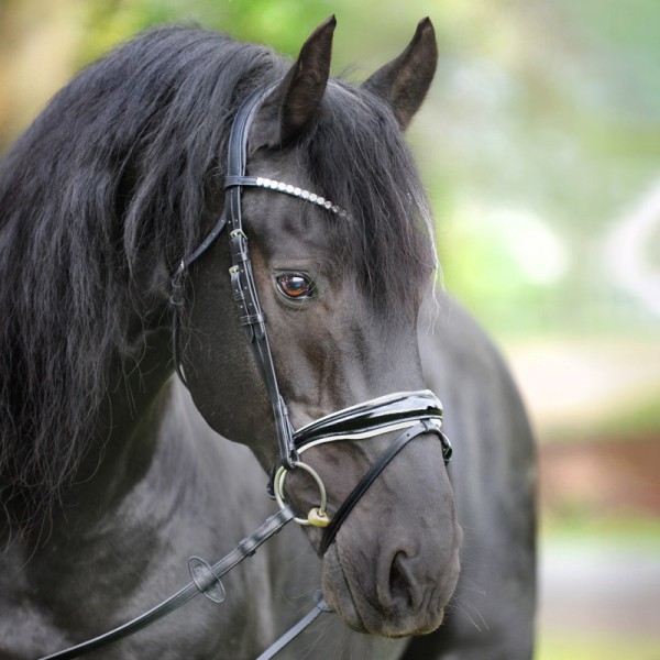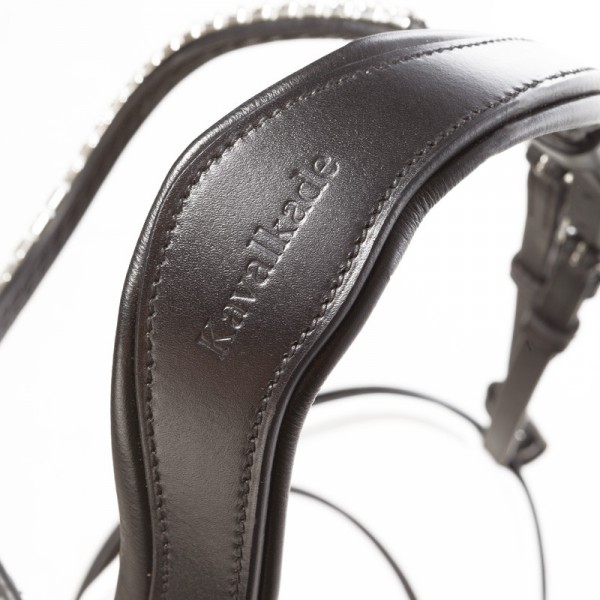 Die englisch-kombinierte TRENSE "Juliana" KavalSH4 überzeugt nicht nur durch ihr schickes Aussehen, sondern auch durch höchsten Tragekomfort: Das Genickstück hat im Ohrenbereich ein Gelpadding, das besonders weich und anschmiegsam ist. Durch das weiche Padding wird der Druck im empfindlichen Ohrenbereich gedämpft. Zusätzlich hat das Genickstück eine anatomische Form, um den Ohren genügend Freiheit zu geben. Der Nasenriemen ist weich unterlegt und schmal zulaufend. Das Stirnband in seiner geschwungenden Form und den großen weißen Strasssteinen sieht an jedem Pferdekopf absolut schick aus. Der Trensenzaum wird mit schmalen Zügeln geliefert.