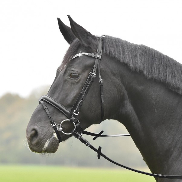 • Reithalfterriemen zur optimalen Druckverteilung über das abgepolsterte Genickstück geführt
