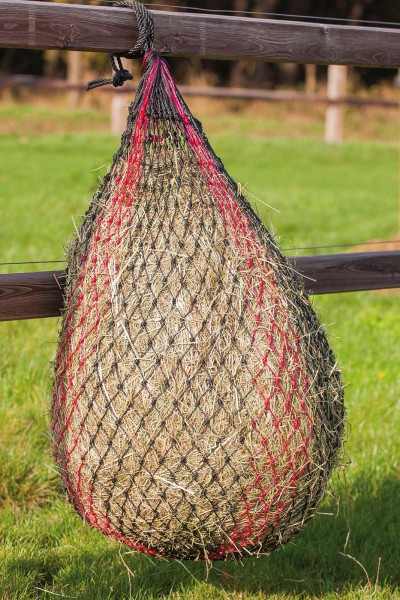 - mit extra kleinen Fressöffnungen (ca. 3,5 x 3,5 cm), damit auch feineres Heu darin gefüttert werden kann und/oder die Pferde länger mit dem Herausziehen der Halme beschäftigt sind
