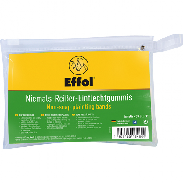 Die Effol Niemals-Reißer-Einflechtgummis sind aus einem extra elastischen Material, verhindern Haarspliss sowie die Knotenbildung in der Mähne. Sie garantieren ein leichtes Einflechten, ohne die Mähne dabei zu strapazieren.