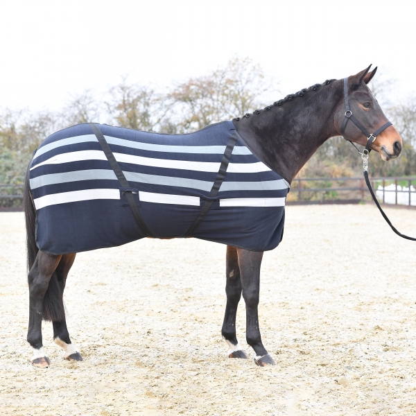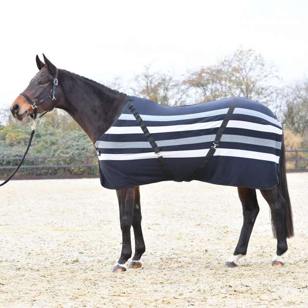 kuschelige Abschwitzdecke in modernem Streifenlook mit Spezialkreuzgurten für Stall und Transport
