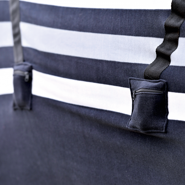 - elastisch angesetzte Kreuzgurte, die bei Nichtnutzung sicher an der rechten Deckenseite in dafür vorgesehenen kleinen REIßVERSCHLUSSTASCHEN verstaut werden können - praktisch z.B. beim Abreiten und Waschen der Decke