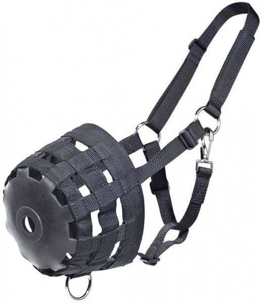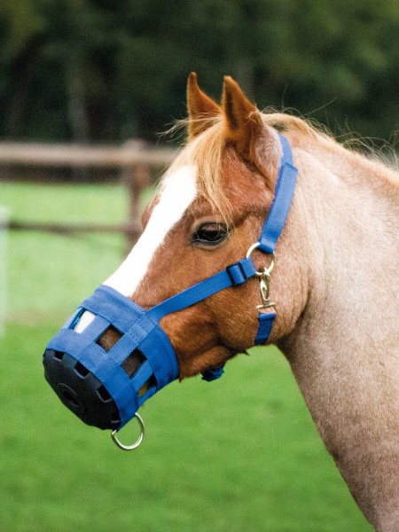 - Maulkorb mit Gummiboden inklusive Fressloch (Ø 2,5 cm) zur Reduzierung der Nahrungsaufnahme insbesondere auf der Weide